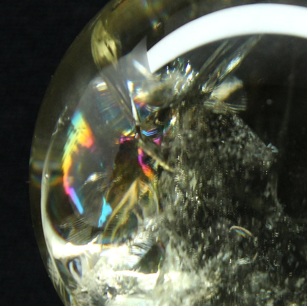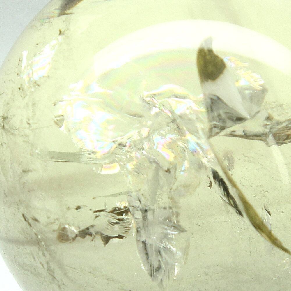 透明感のある優しいイエローカラーの中に広がるインクルージョンと、内部に現れる虹(レインボー)が幻想的で神秘的な一品です