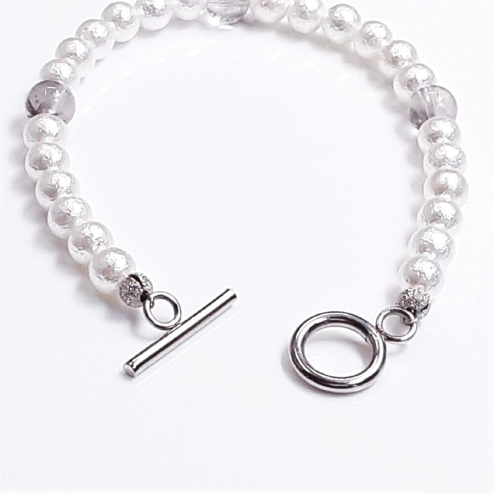 ◇フォーマルシーンで活躍するパールを基調に、プラチナルチルと組み合わせて製作しました。流行りの留め具にマンテルパーツを使用しております♪
