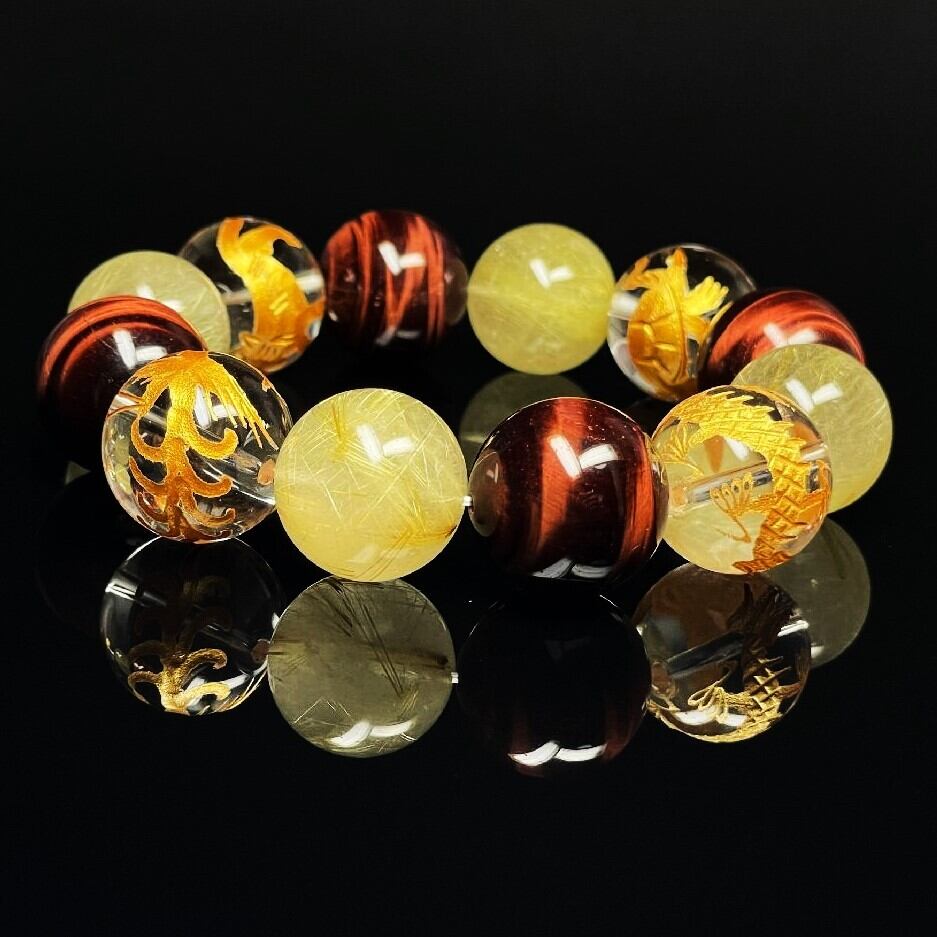 【ビジネスチャンスを掴みたい方必見】18ミリ 金彫四神獣 本水晶 レッドタイガーアイ ゴールド ルチルクォーツ ブレスレット 相性抜群 天然石 最強金運 パワーストーン 開運 ホワイトデー 送別会 就職祝い 卒業祝い プレゼント ギフト 贈り物 sisin11 | 京海堂