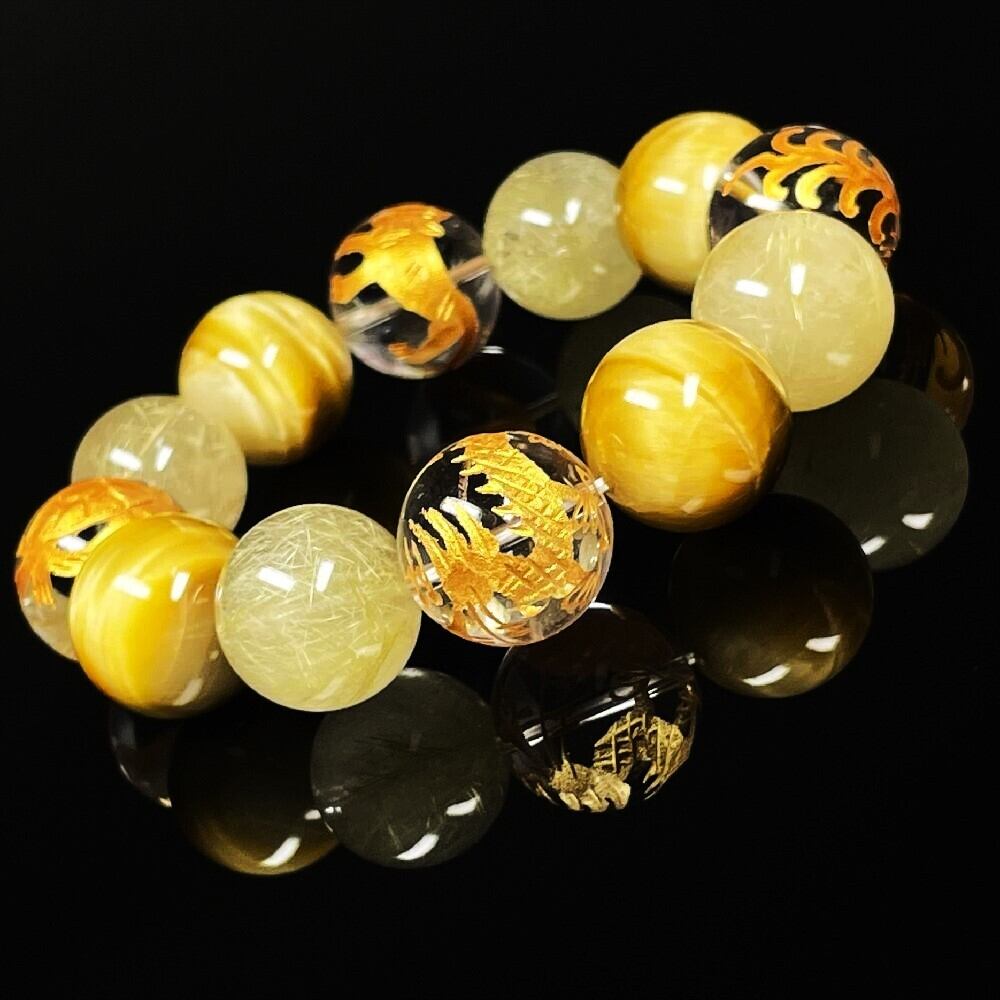【成功を引き寄せる数珠】18ミリ 金彫四神獣 本水晶 ゴールデンタイガーアイ ゴールド ルチルクォーツ ブレスレット 相性抜群 天然石 最強金運 パワーストーン 開運 敬老の日 お月見 ハロウィン 仮装 パーティ プレゼント ギフト 贈り物 sisin15 | 京海堂